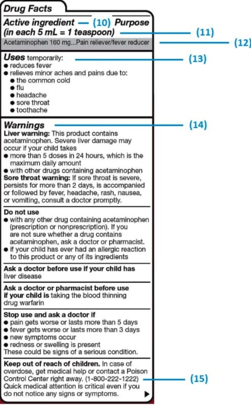 Every OTC medicine has a Drugs Facts Section. This is required reading before giving or taking a medicine! The FDA requires a standard format for the Drug Facts section. Whetherit is tube of toothpaste or a bottle of allergy medication, the following information must appear in this order: