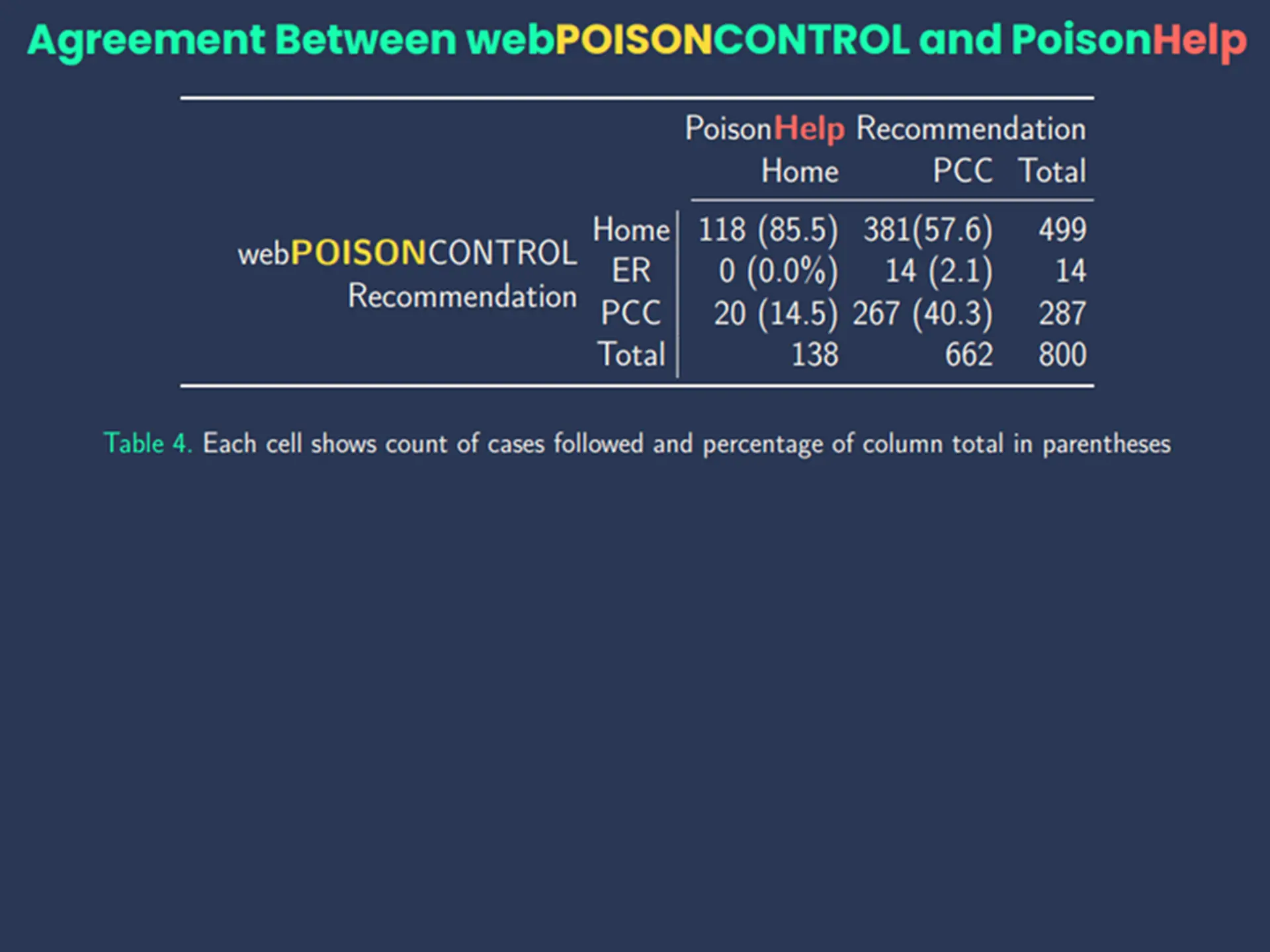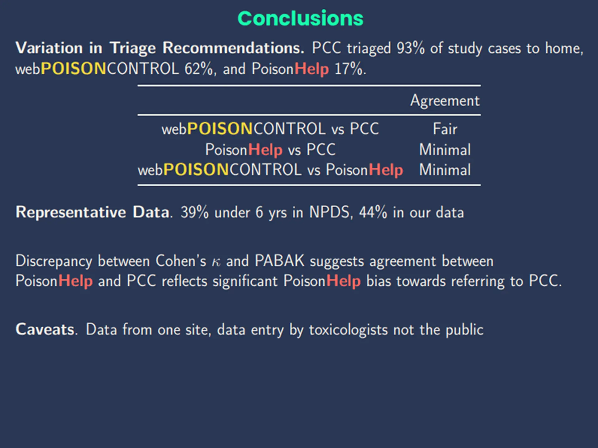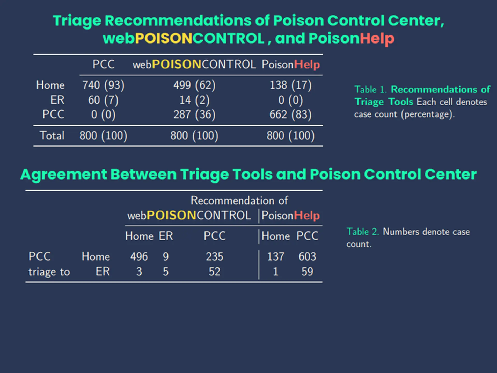 Study goal: Determine the variation in triage recommendations across PCC, PoisonHelp, and webPOISONCONTROL for uncomplicated exposures.